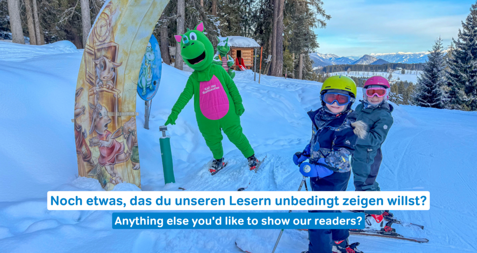 The Rittisberg is perfect for us because it is particularly suitable for families: firstly, there are mainly blue and red pistes, as well as children's lifts and - the absolute highlight for our kids - the fairytale descent. Small stations briefly tell different fairytale stories. From Rumpelstiltskin and the seven little goats to Hansel and Gretel, you can meet everything that has a place in the world of fairy tales. And there is often a statue of the fairy-tale character from the Rittisberg: the Rittisberg mascot Kali, the Ramsaurus.