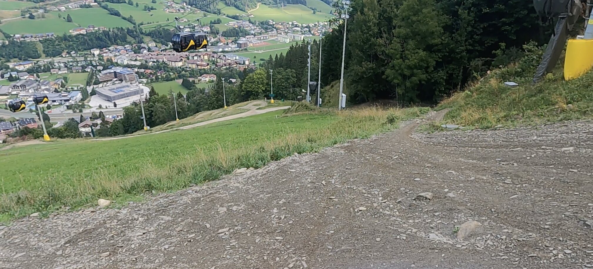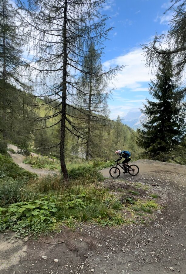 We quickly pick up our day ticket at the ticket office and are already in the gondola for the first ascent. We decide to start with the blue trail to slowly feel our way up. And it really knocks our socks off. Perfectly shaped, no deep potholes, fast steep bends and lots of small and slightly larger ramps invite you to step on the gas. You don't have to take off on the ramps, but you easily can. A descent is 15 kilometres long and as a learner you can really feel it in your arms and hands. We loved the route so much that we had to do it twice more. We needed about an hour for one lap (ascent and descent).