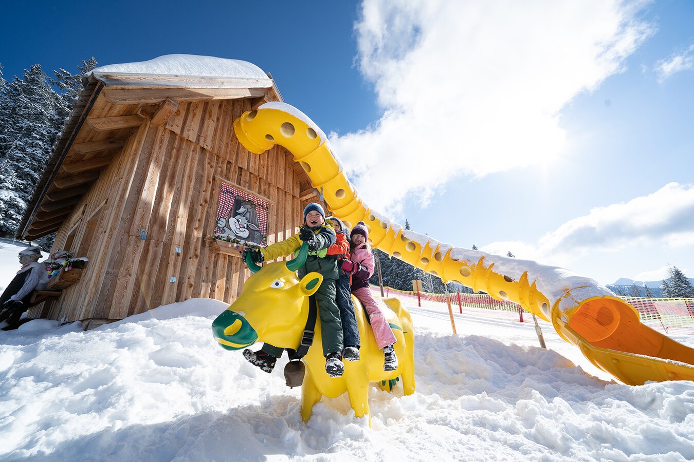 3 children sit on a yellow-green cow and laugh | © Josh Absenger