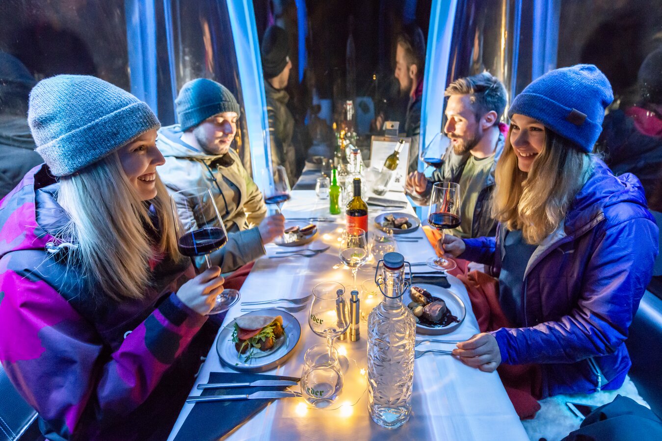 An exclusive 5-course gourmet menu awaits you in the gondolas, prepared by the renowned TOM Almhütte. You can also enjoy carefully selected wines from the Alphart winery in Traiskirchen. The perfect harmony of regional ingredients and fine wines ensures an incomparable flavour experience.