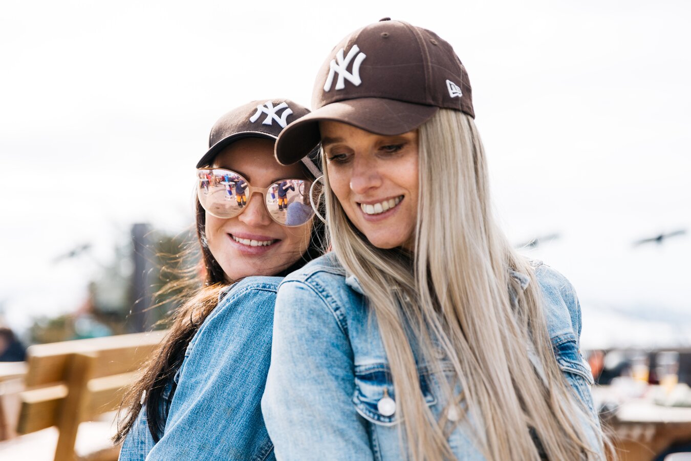 Two young women in denim jackets and caps smile in the sun during a spring event on Reiteralm | © Gerald Grünwald