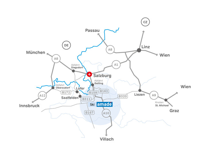You can reach Ski amadé directly via the A8 Munich - Salzburg motorway and then via the A10 Tauern motorway or via the small German corner.