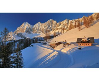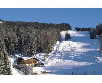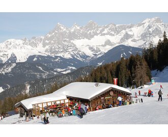 Mitte Abfahrt Vorderfager, in der 300 Jahre alten Hütte verwöhnen wir mit den "Lechneralm-Schmankerln". Große Sonnenterrasse.