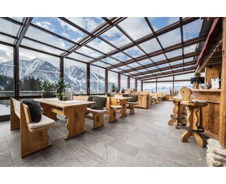 Highlight of the SternAlm: the panorama winter garden with a view over the Salzach Valley – from the Kitzsteinhorn over the majestic Hochkönig to the Tennengebirge! How about an Aperol at sunset? A wonderful experience.