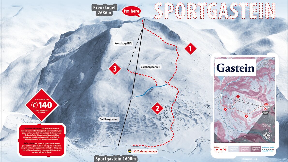 The Golden Powder ski route is the longest route with a length of 5 km and a height difference of 664 meters in the ski area of Sportgastein. The start of the ski route is directly below the top station of the Goldbergbahn.