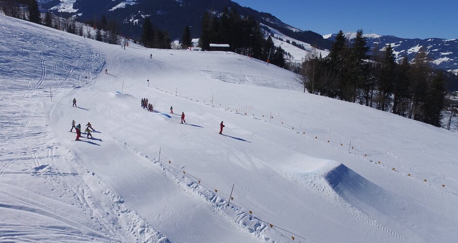 Ideal for beginners, an easy line awaits you, with 2 boxes, a jump and a wave run. More advanced riders can risk leaping over the show jump at the Skishow Maria Alm.