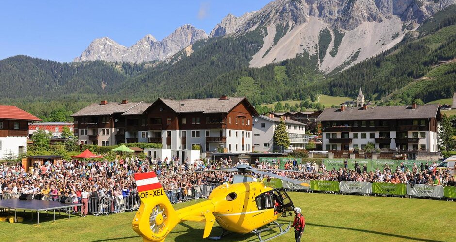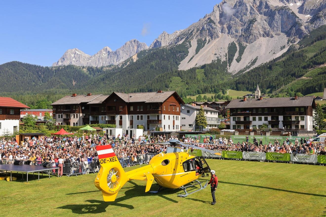 - 12:00 – Mittagspause im Festzelt (Festzelt Ramsau 350, 8972 Ramsau am Dachstein) Nebenprogramm mit Souvenirshop, Bergretter Merchandise Artikel und Selfie-Point