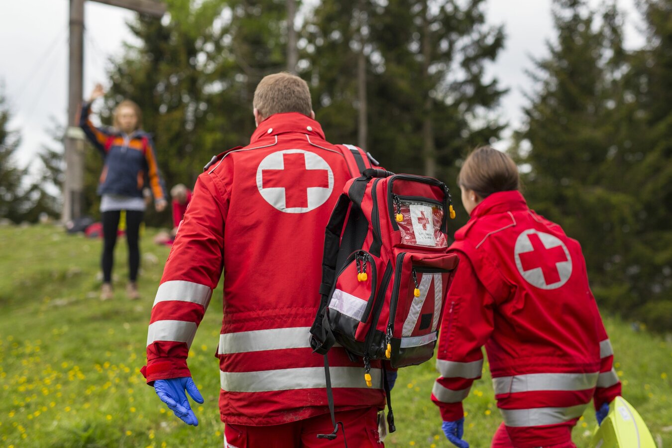 Zwei Sanitäter vom Österreichischen Roten kreuz gehen zu einer winkenden Person vor einem Gipfelkreuz | © OERK - Thomas Holly Kellner