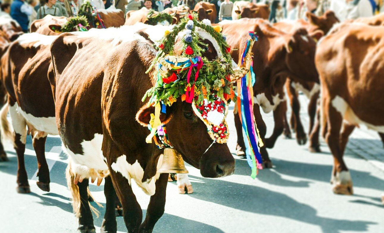 ab 12:00 Uhr: Präsentation eines traditionellen Almabtriebs mit festlich geschmückten Kühen, Pferden und Kleintieren mit Darstellung des bäuerlichen Lebens, dekorierten Festwägen und Jagdwägen.