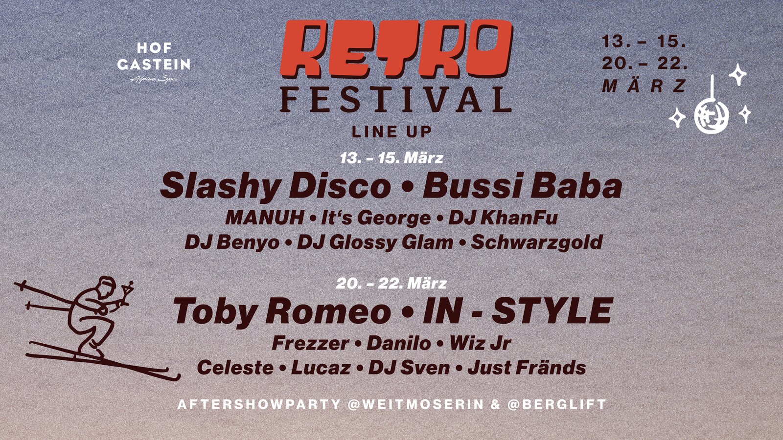 Das Retro Festival in Bad Hofgastein bringt Festival-Vibes auf die Piste – mitten in der OFF Spring Zeit in Gastein, wenn Winter, Sonne, Genuss und Frühlingsgefühle zu einem besonderen Lifestyle-Feeling verschmelzen.