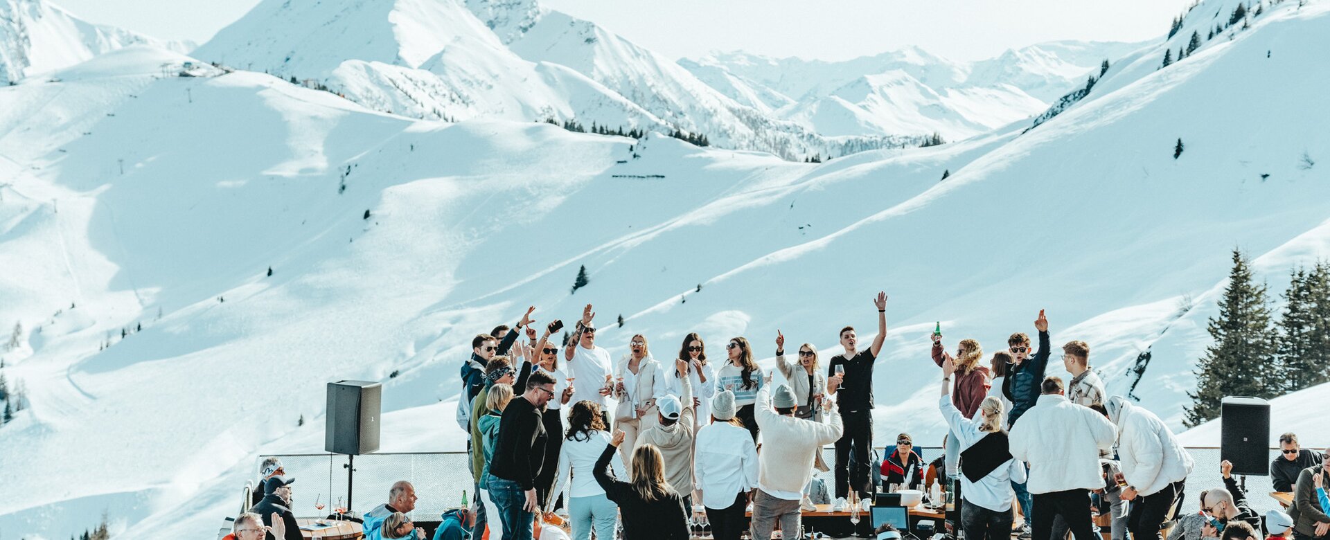 Feier mit uns auf der Sonnenterrasse der Wolke7 und genieße den atemberaubenden Ausblick auf die verschneite Bergwelt. DJ-Sounds, coole Getränke und gute Laune inklusive.