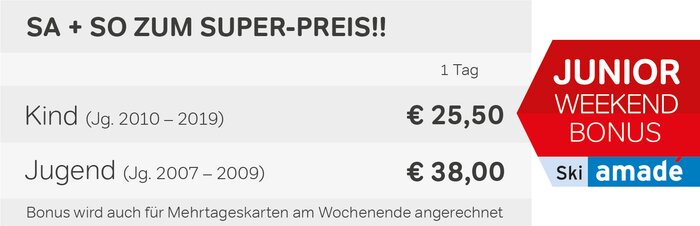 Für Kinder und Jugendliche am Wochenende zum Super-Preis*! In Ski amadé fahren Kinder und Jugendliche an jedem Wochenende (Samstag und Sonntag) besonders günstig.