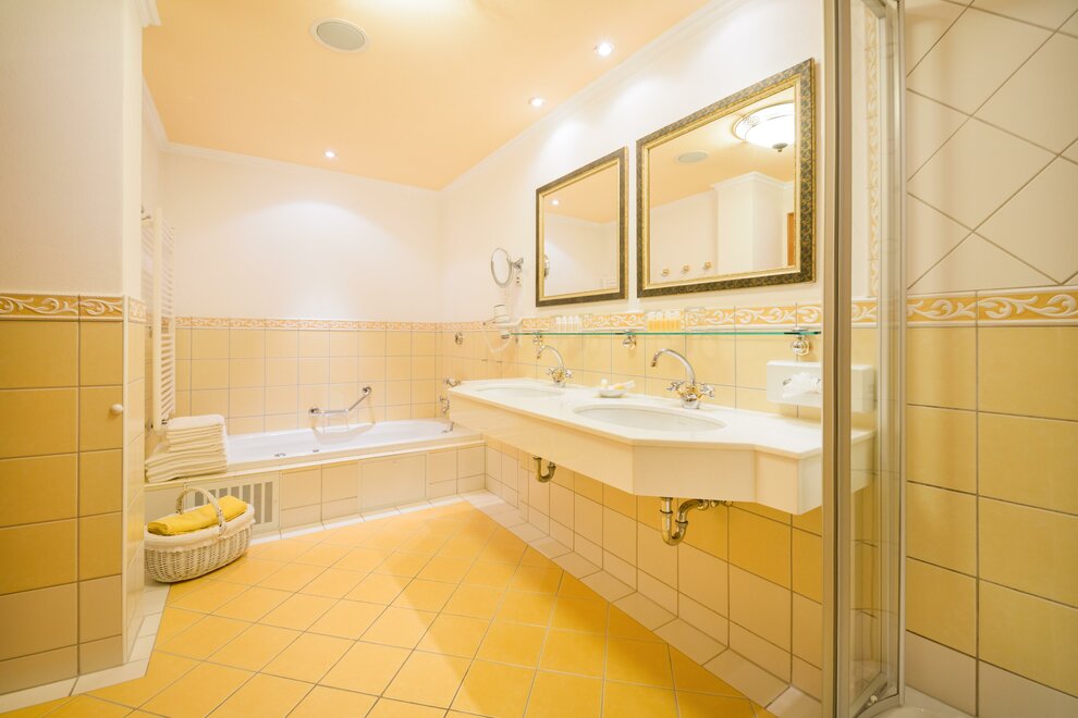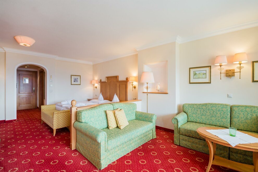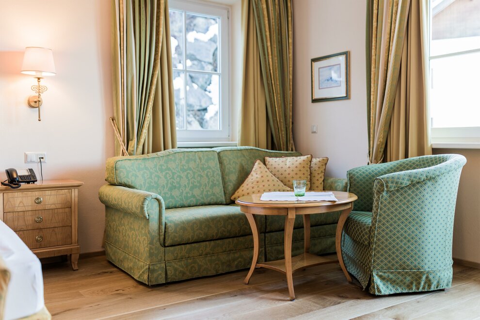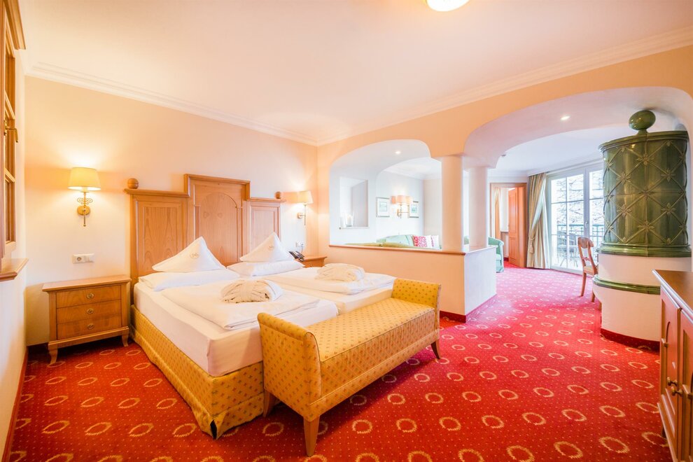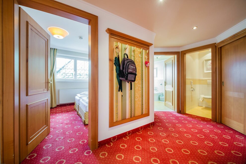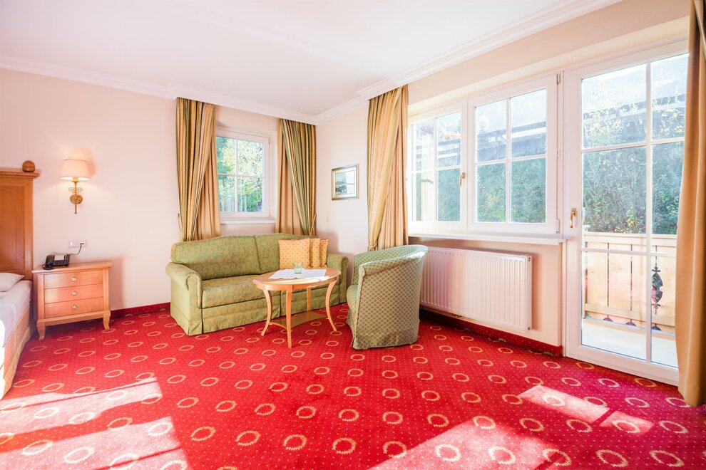 The 40 m² “Amadé de luxe” rooms have a balcony in a particularly quiet mountain location (restricted view). With a pull-out couch, these rooms can accommodate up to 4 people. The bathroom has a bathtub and two sinks, with a separate toilet.