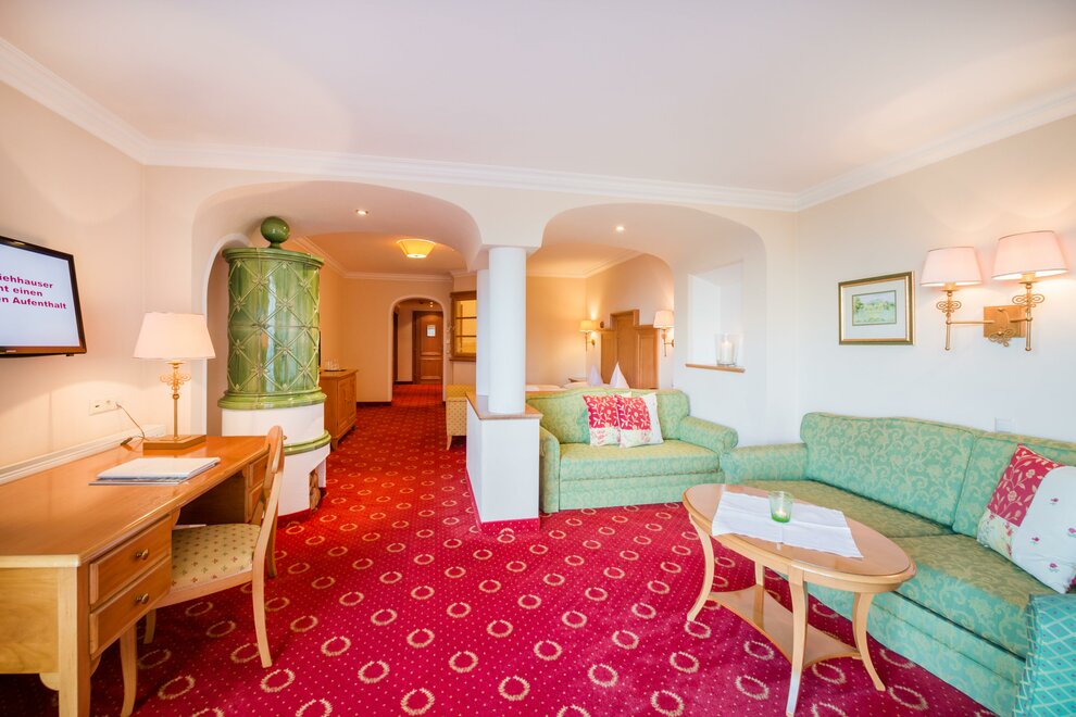 The 49 m² suite is like a small apartment with separate living room and bedroom, living area with cozy corner/sofa bed, tiled stove, desk, large bathroom with tub, shower, separate toilet, and south-facing balcony with panoramic mountain views.