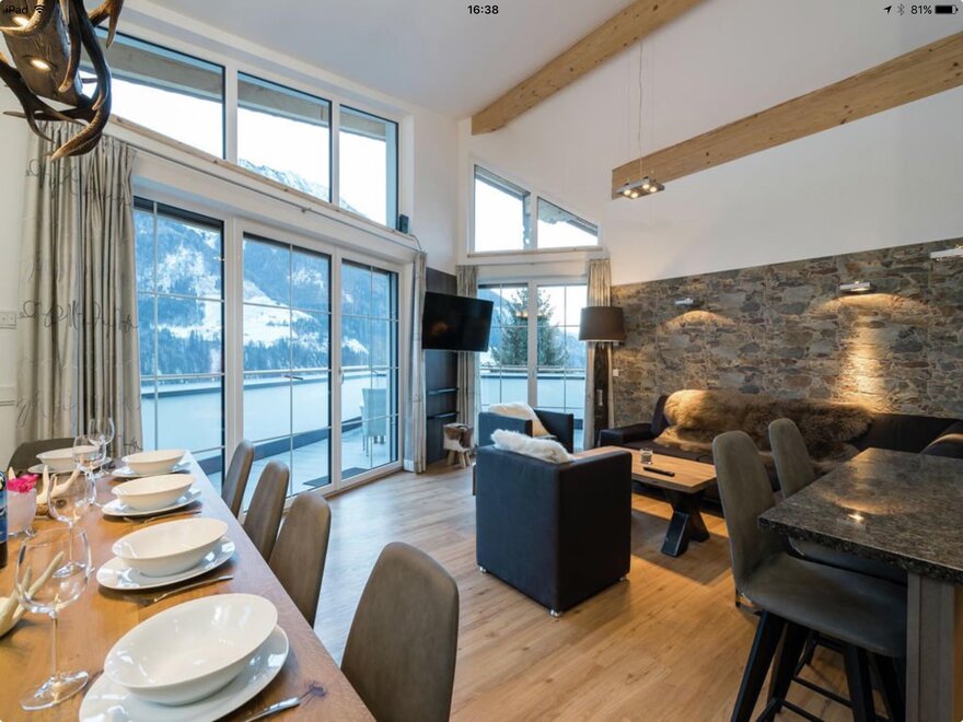 De ruime woon- en eetkamer laat niets te wensen over, zit- en relaxmogelijkheden voor 10 personen met grote panoramische ramen met uitzicht op het Heukareck.