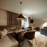 comfortable living room with seating area, table and kitchen, 2 separate double room, entranceway, bath, seperated WC, telephone, TV, mini-bar, hairdryer, bathrobe, spacious balcony or roof-top terrace
