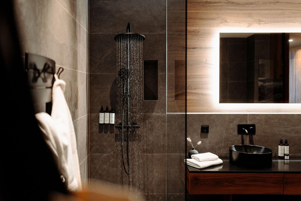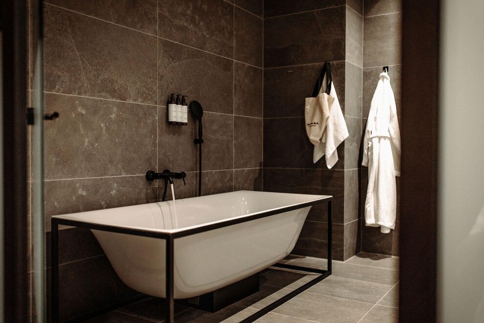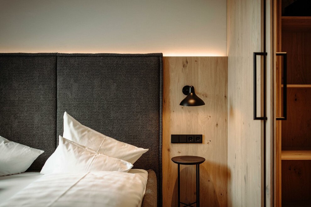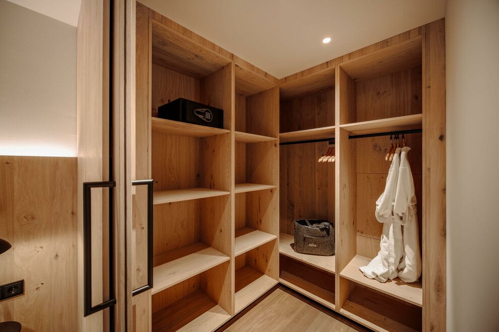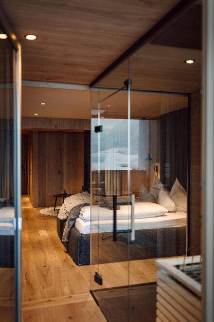 modern alpine style: comfortable living room with seating area, bedroom separated by wooden wall, entranceway, shower, WC, telephone, cable-colour-TV, mini-bar, hairdryer, bathrobe, balcony
