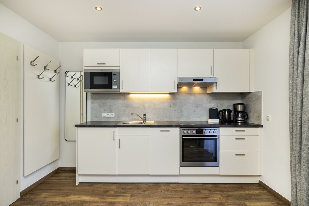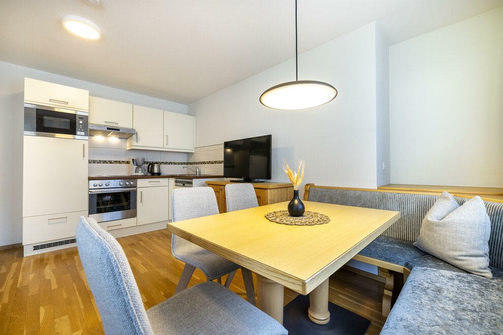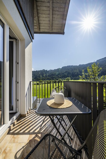 The Type A Superior (approx. 30 m²) is a two-room apartment and is suitable for two adults or a family with one child (view of the ski slopes of Flachau, either with garden terrace or partly with balcony). It has a double bed, an extra bed, a separate living area with kitchenette and seating, a bathroom with shower and WC, free access to WiFi, a room safe and cable TV.