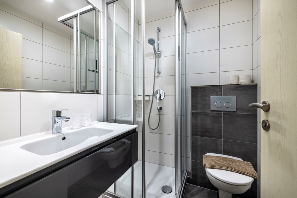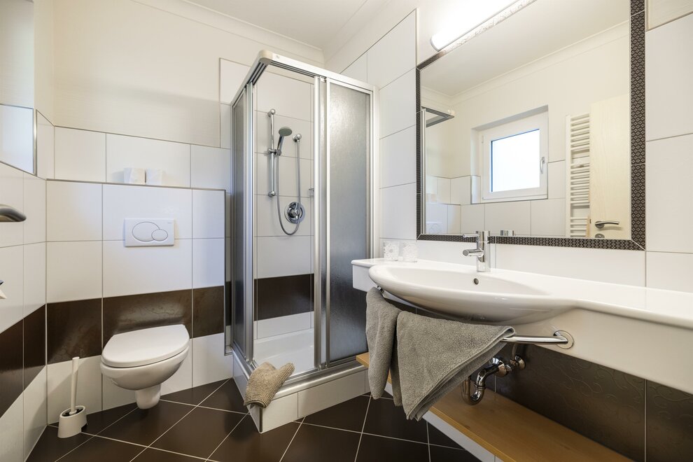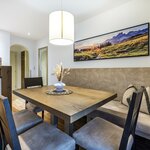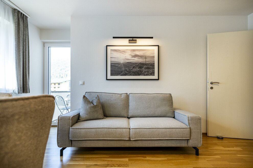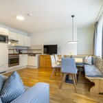 The type C (approx. 65 m²) is a three-room apartment and is suitable for up to five people (with balcony and view of the Flachau ski slopes). It has two separate bedrooms, two bathrooms with shower and WC, a separate kitchen-living room (with dishwasher and oven) with sitting area and comfortable couch. You will also be offered free access to WiFi, a room safe and cable TV.