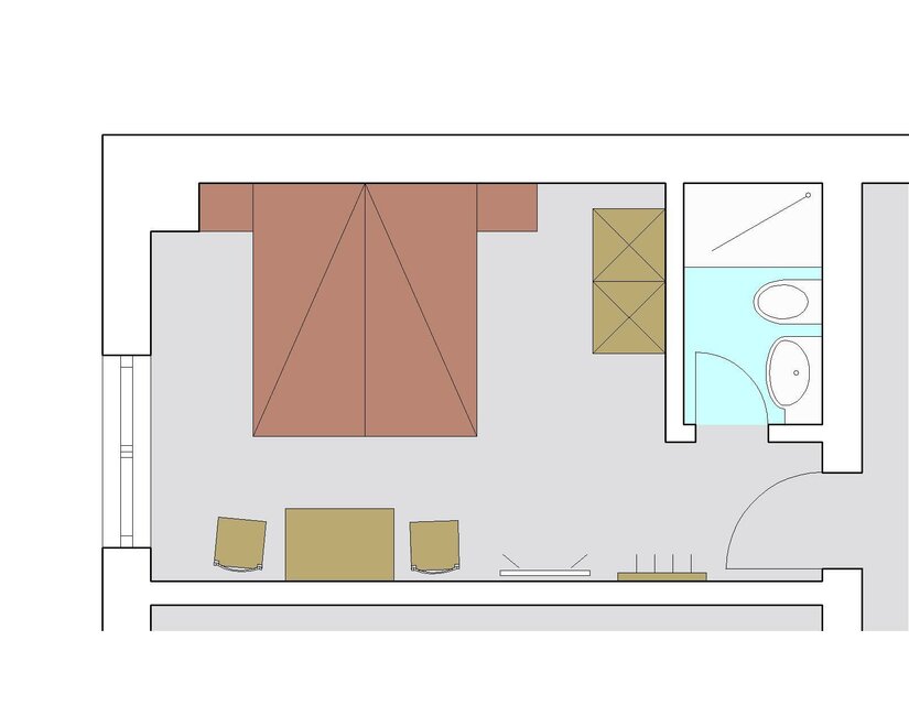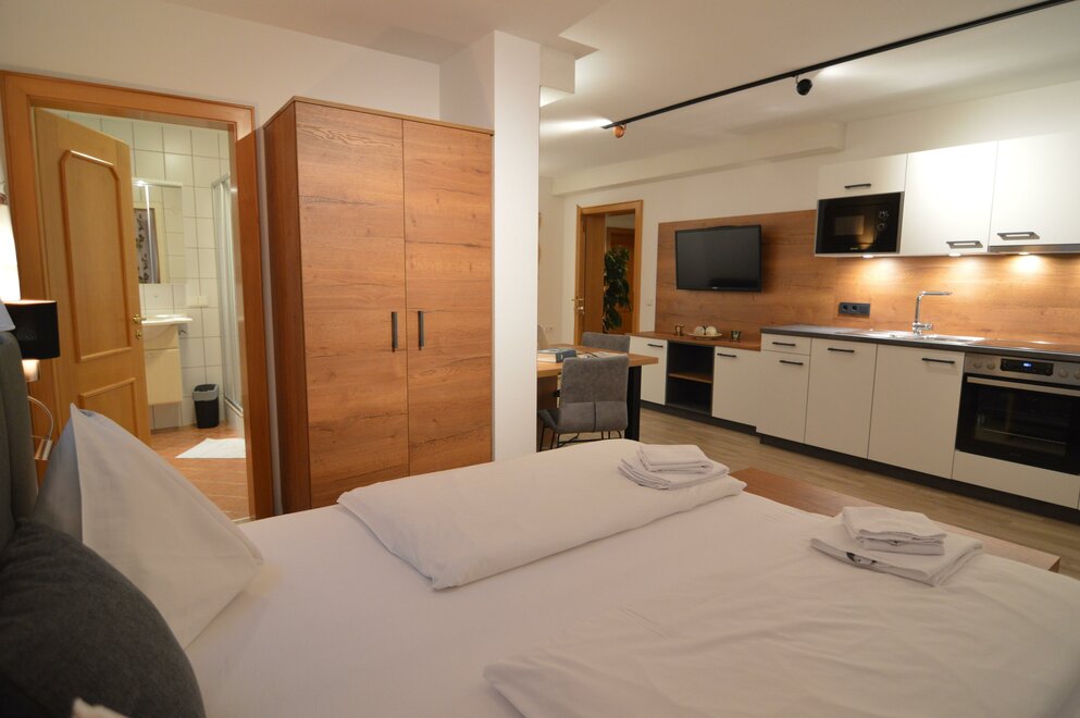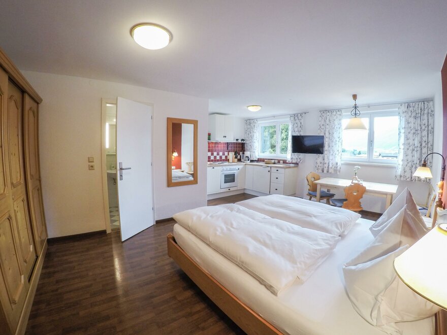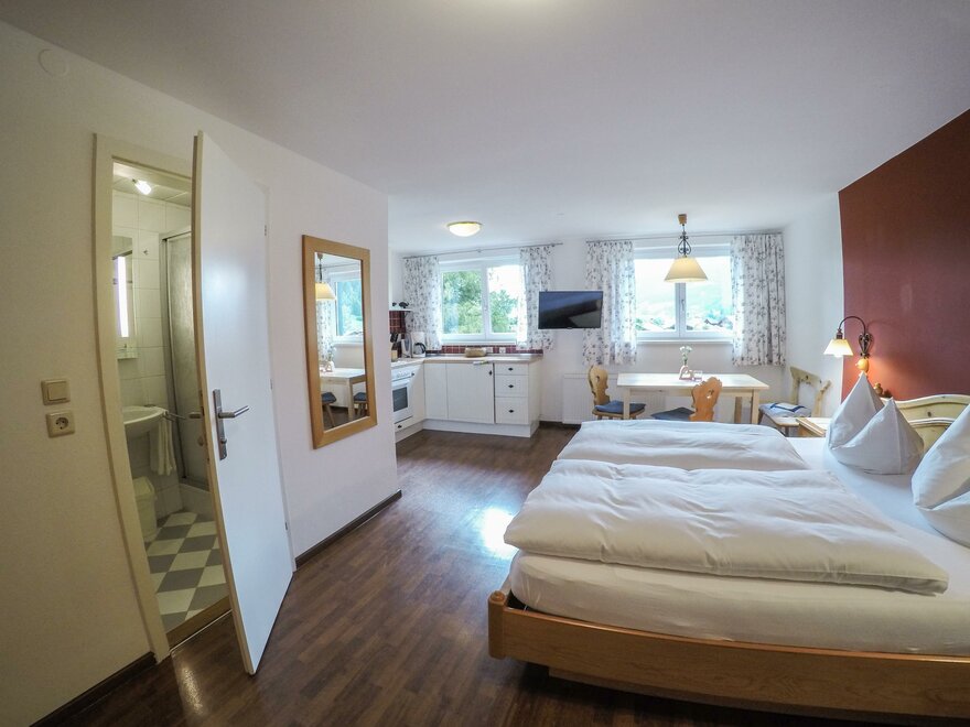 The double room has 22m², furnished with a double bed, shower/toilet, little kitchen, flat-cable TV and free WiFi. ( No breakfast)