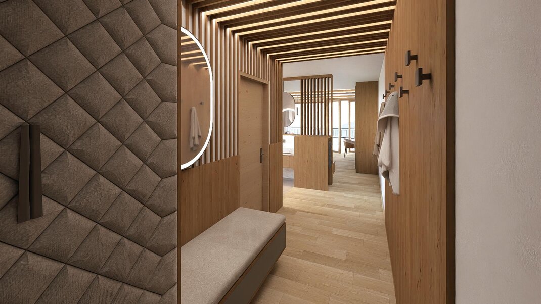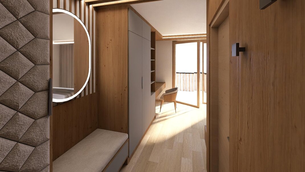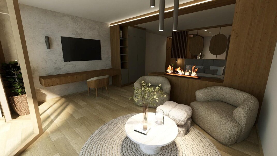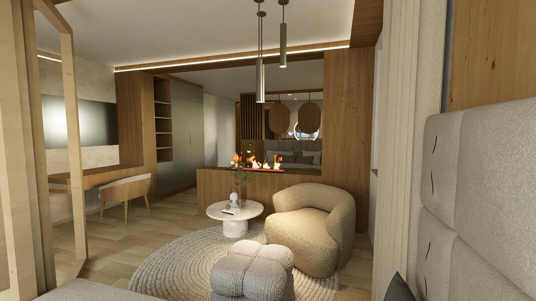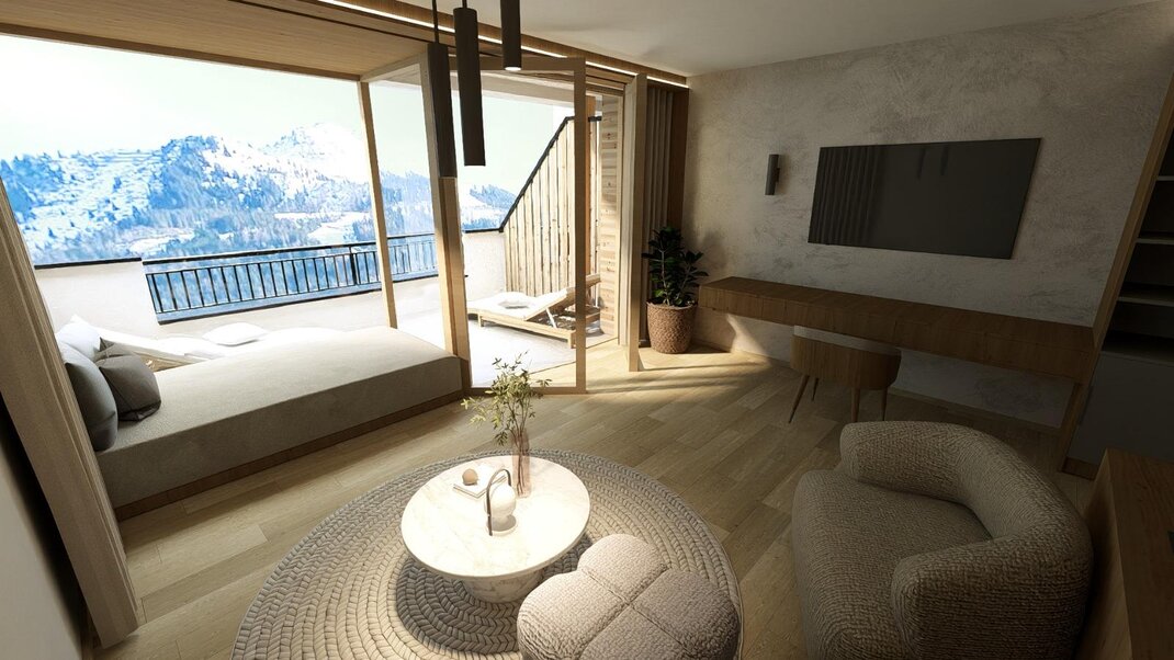Alpin-modern luxury living dream with a lot of beautiful details and wood floor, dreamlike living room with coolfire stove and big southwest balcony, bathroom with steam shower & freestanding bathtube with mountain view, sleeping room plus a second small sleeping room with extra toilet, minibar