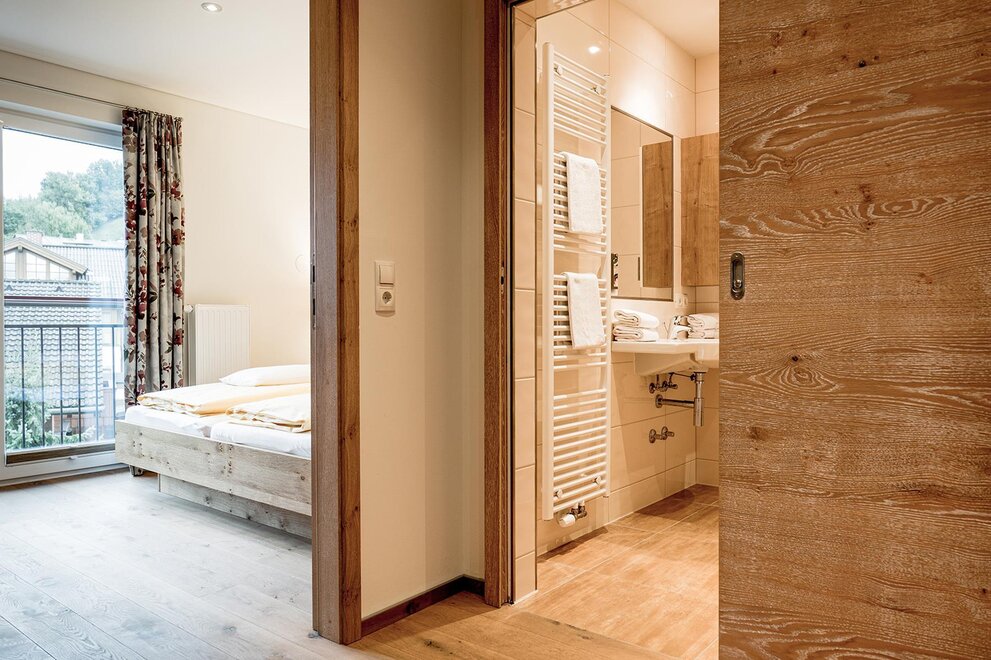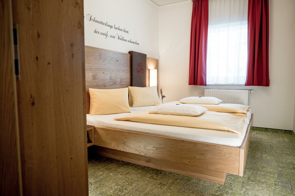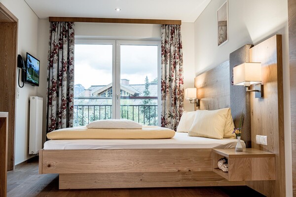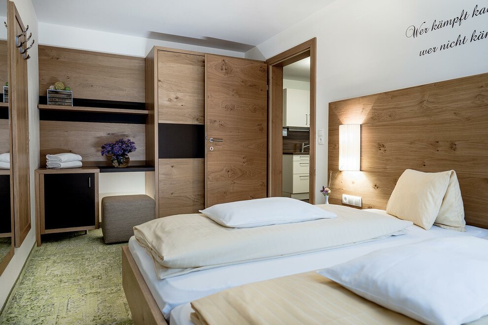 Tweepersoonskamer van ca. 22 m². De tweepersoonskamers beschikken over een tweepersoonsbed, 1 badkamer met douche en toilet en een koelkast (ongeladen). Alle appartementen en kamers zijn uitgerust met telefoon, tv, kluis, haardroger en WLAN-internet.