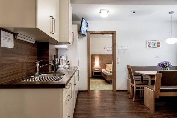 De volledig uitgeruste appartementen en kamers zijn royaal opgesteld, warme kleuren en veel hout zorgen voor een aangenaam woongevoel. Je geniet van een verkwikkende pauze en rust in de kleine, maar fijne wellness met Finse sauna, kruidensauna en infraroodcabine. Verder comfort biedt de parkeergarage (reservering en tegen betaling) met directe toegang tot het appartementencomplex en de lift, evenals een ski- en schoenenberging met verwarmde en afsluitbare skisafes.