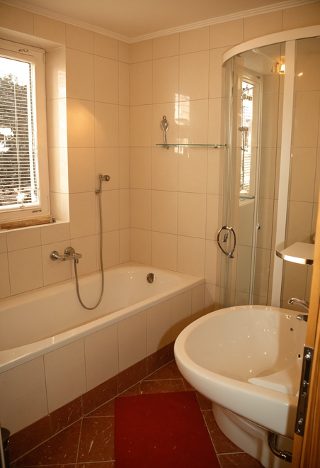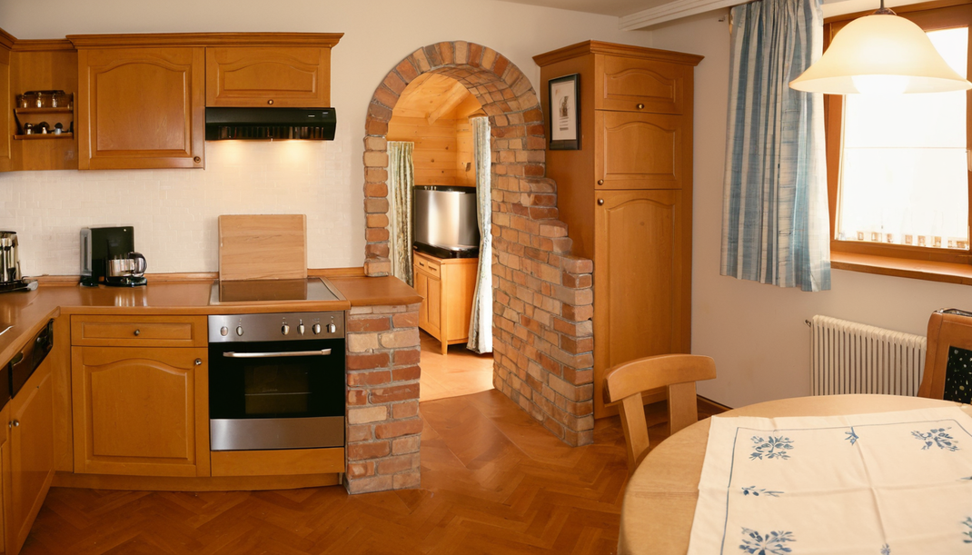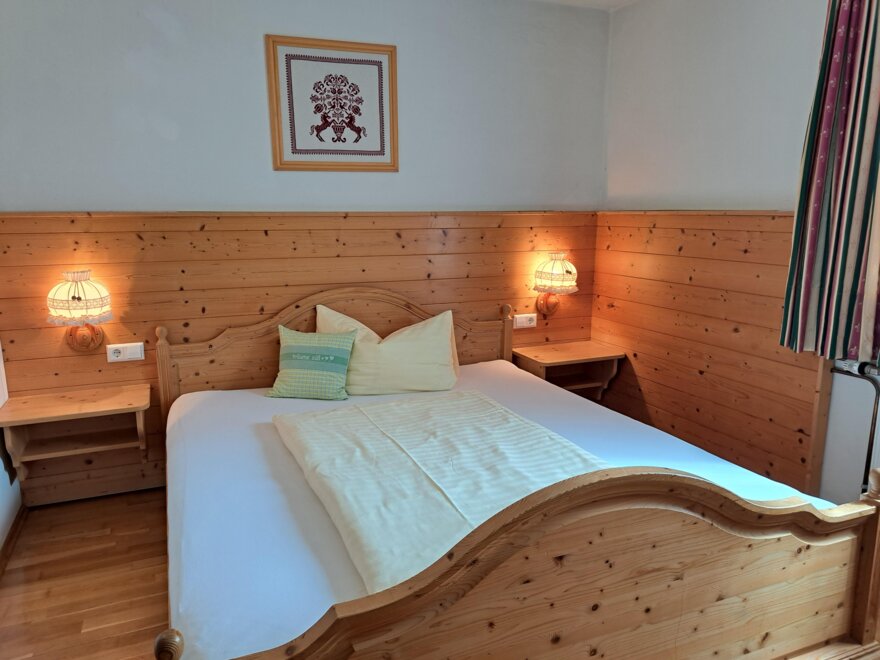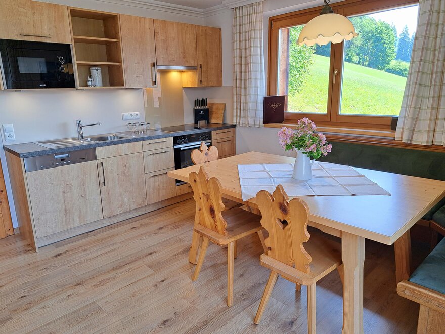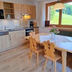 Apartment Bergblick ideal for 5-8 persons (about 100 m²): Entrance hall, living room with dining area and fully equipped kitchen - all dishes, electric stove with oven, dishwasher, fridge and freezer, coffee machine, kettle, microwave oven, satellite TV and radio. 3 bedrooms with double beds (if required cot and extra bed) and separate cozy wellness-living room (infrared sauna, shower, couch, LCD TV), bathroom with shower, bath and toilet, separate toilet. Great view from the balcony with covered, rustic sitting area.