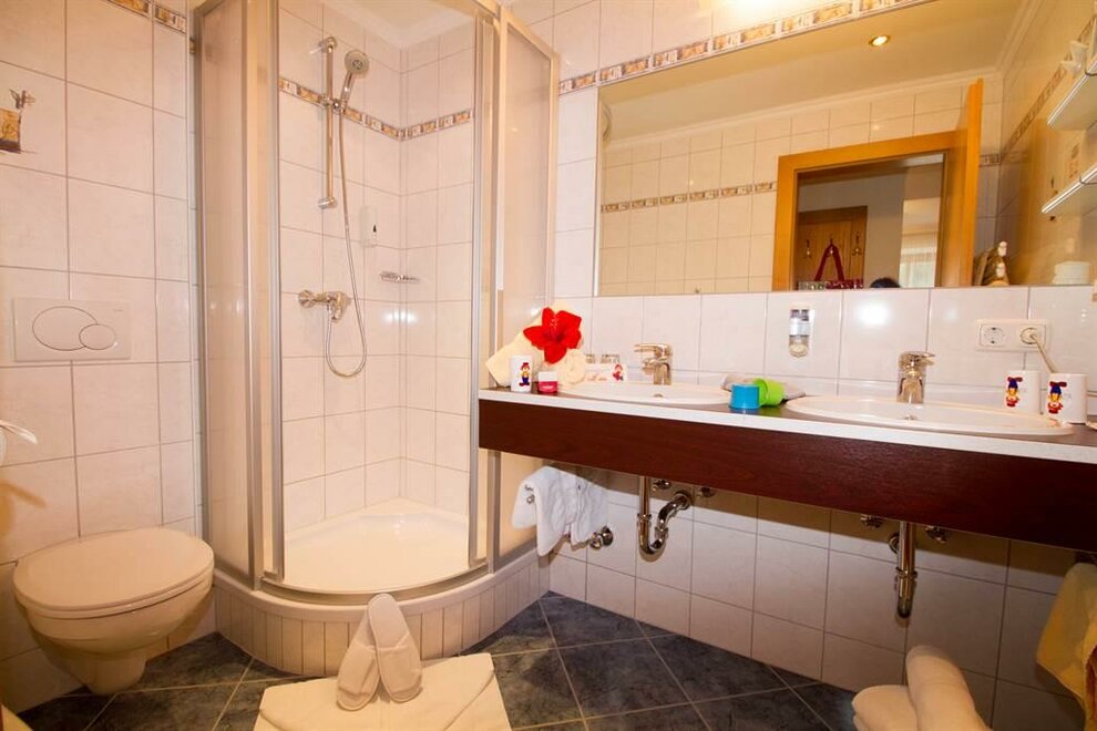Tweepersoonskamer met douche en wc, kinderkamer met stapelbed, ruim gescheiden woonruimte met grote zithoek, keukenblok met 2-pits kookplaat, koelkast met vriesvak, SAT-TV en SAT-radio, doorkies telefoon, balkon.Familiesuite (3 kamers) EDELWEISS