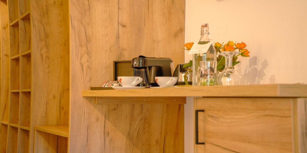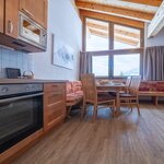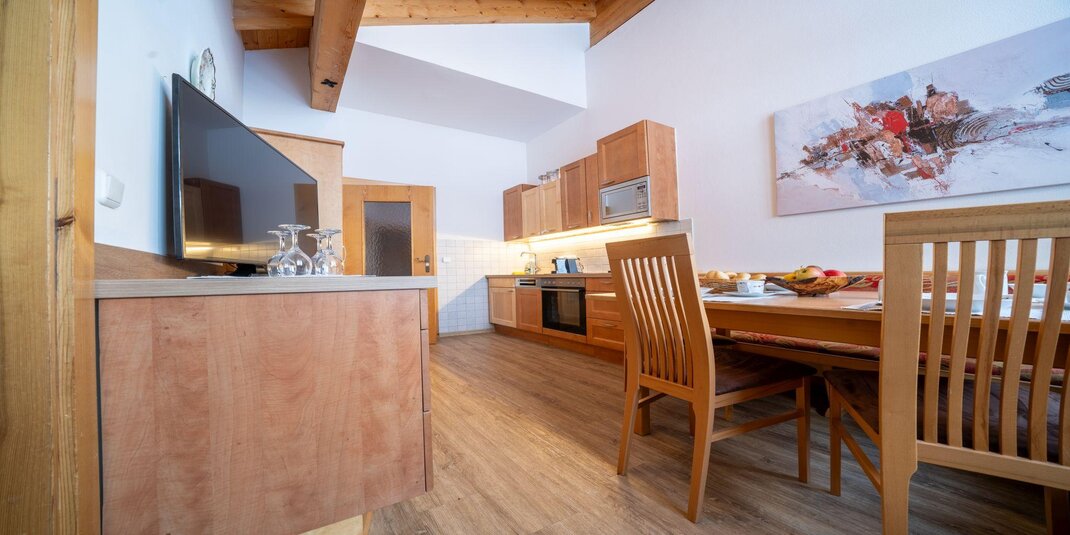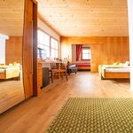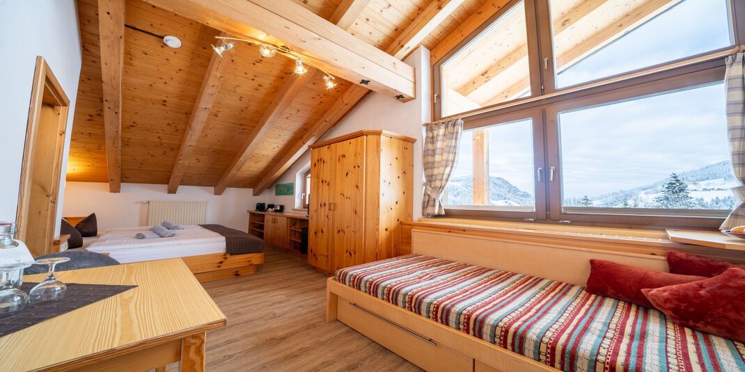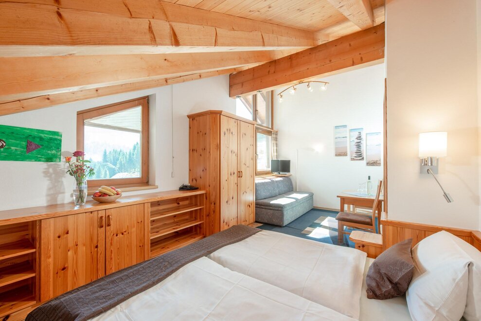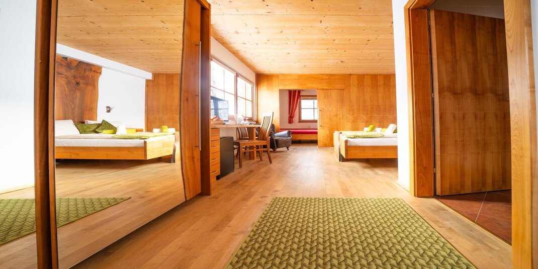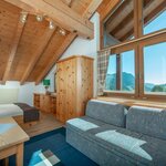 Klein maar fijn is onze mooie studio versierd met meubels van ceder- en notenhout. Praktische kamer voor 2 tot 4 personen met afscheiding voor de kinderbedden en uitzicht op de Dachstein. Genomineerde kamer bij de Salzburger meubelmakerwedstrijd. Gebouwd door meubelmakerij Scherübl in Radstadt.