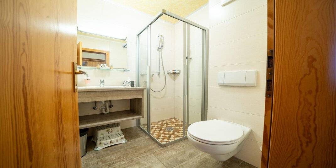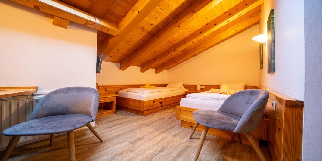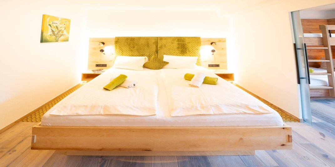 In onze grote en comfortabele familiekamer met twee slaapkamers en elk een eigen badkamer kunnen jullie met twee, drie, vier of zelfs vijf personen verblijven. Hart, wat wil je nog meer?