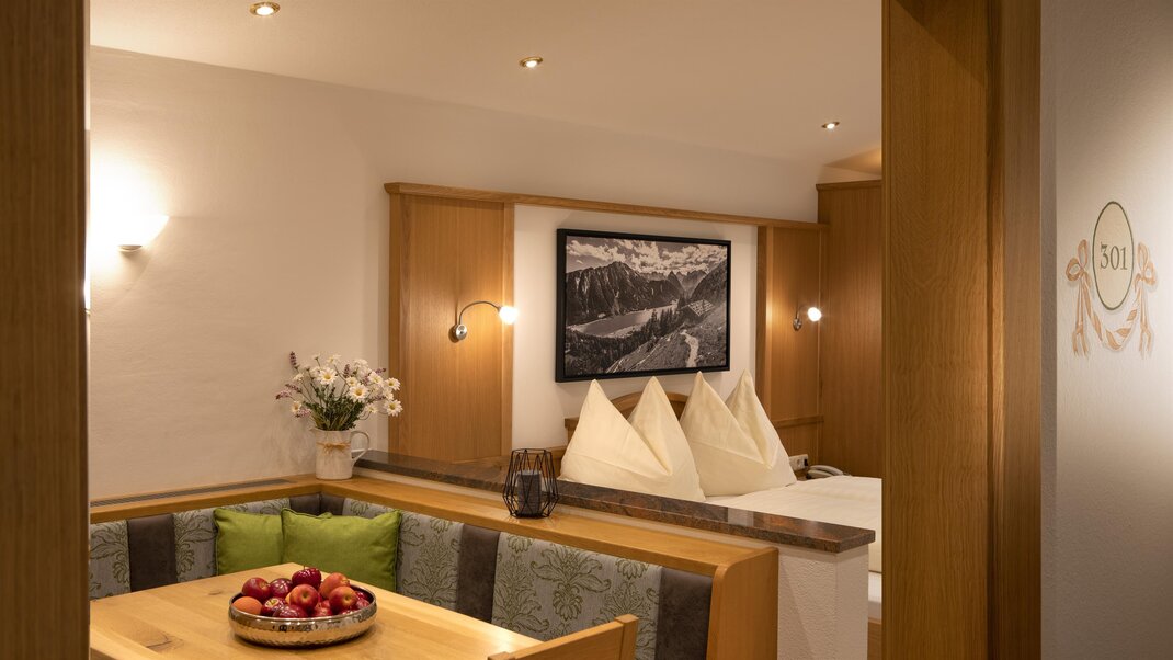 livingroom with double bed and sitting area
