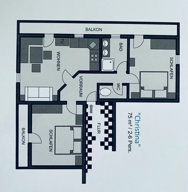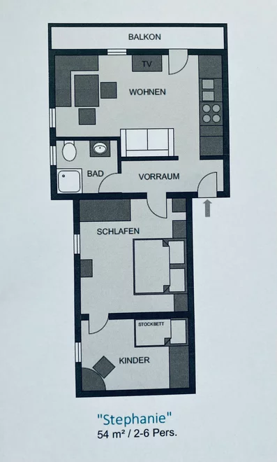 54m² grote FeWo voor 2-4 personen, woonkeuken, 1 slaapkamer, 1 kinderkamer (stapeldbedden), douche/WC, voorhuis, terras, sat-tv, radio/cd-speler, volledig uitgeruste keuken incl. oven, vaatwasser, magnetron, koffiezetapparaat en volledige serviesvoorziening.