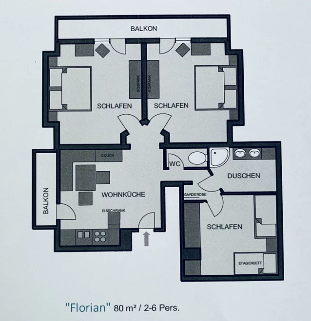 80m² grote mansarde appartement voor 2-6 personen, grote woonkeuken, 2 slaapkamers met tweepersoonsbedden en 1 slaapkamer met 3 aparte bedden, douche/WC gescheiden, balkon, radio-satelliet-TV, compleet uitgerust keukentje inclusief oven, vaatwasser, magnetron, koffiezetautomaat en servies.