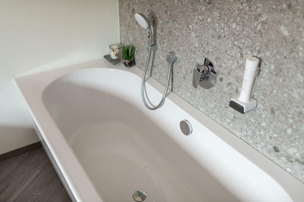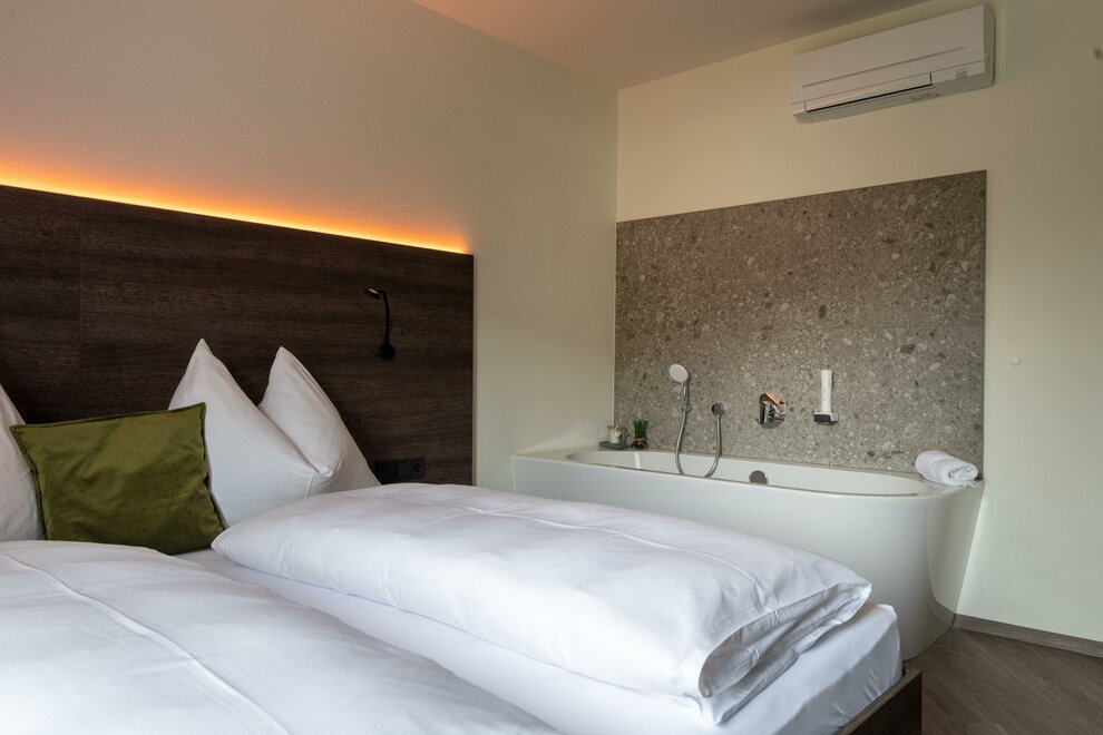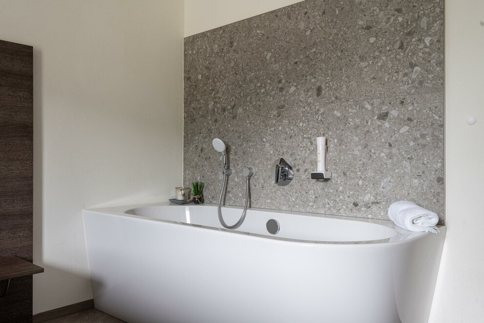 Our cozy Premium Terrace apartment offers a beautiful family room with a high-quality box spring bed and fully equipped kitchen. In addition, you will enjoy a private garden with sun loungers perfect for enjoying nature.