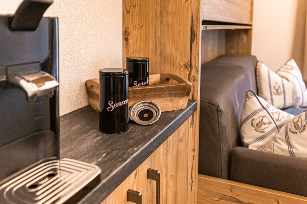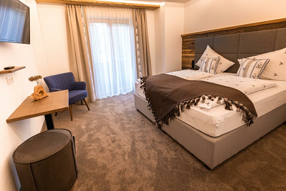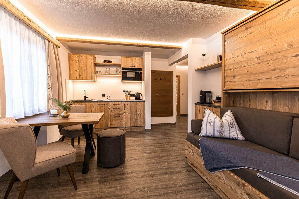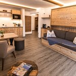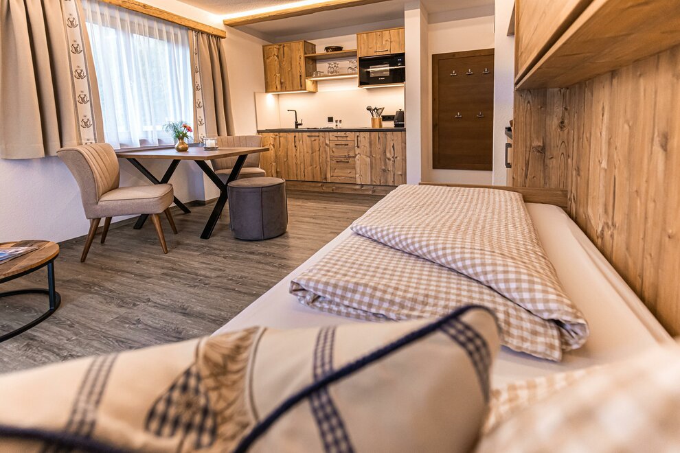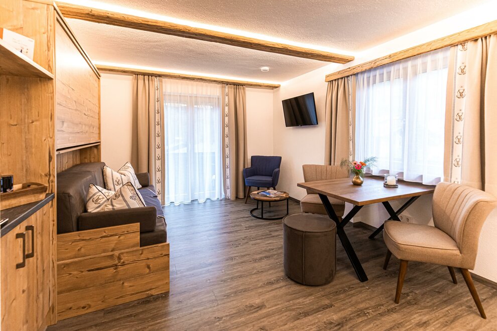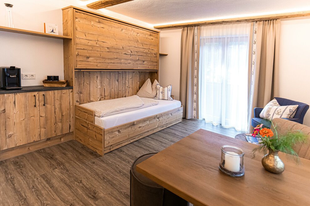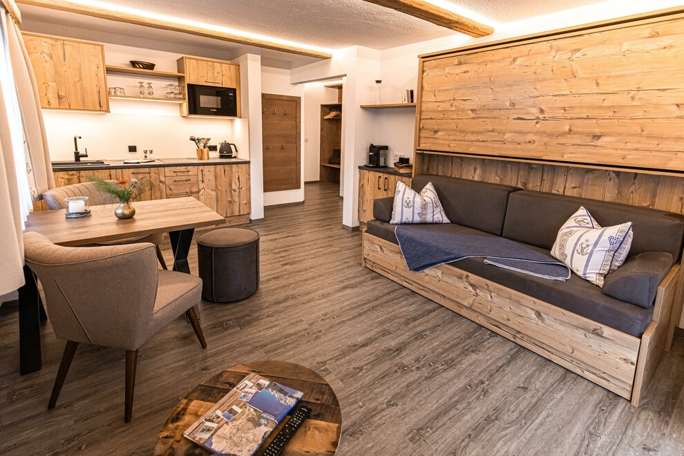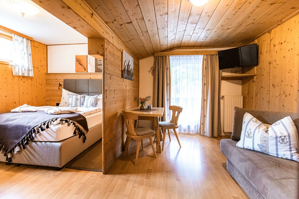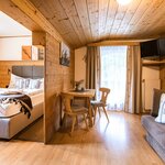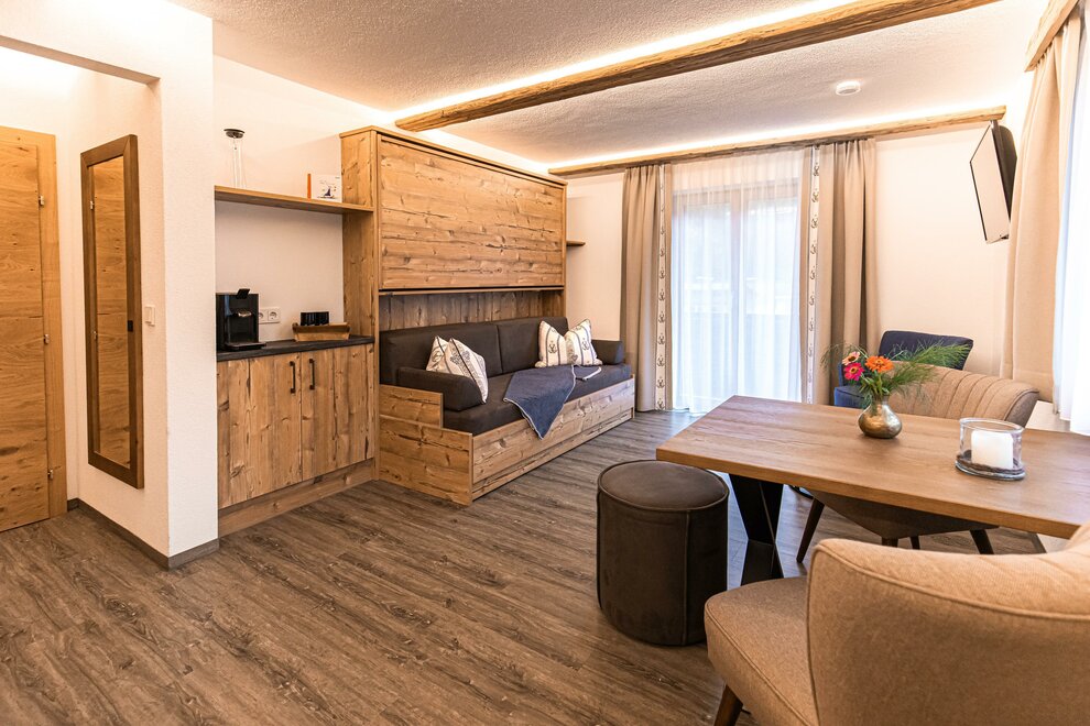 AlpineChic Suite, slaapkamer met KingSize Boxspringbed en woonruimte met exclusief Flexino bed voor 2 tot 3 personen.