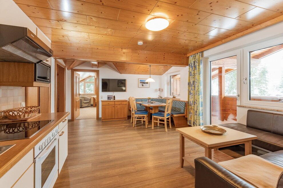 In our comfortably furnished apartments in traditional Austrian style you find a private panorama sauna on the balcony, a brightly living and dining room with a modern kitchen unit, a big bathroom, separate toilet and balcony.
