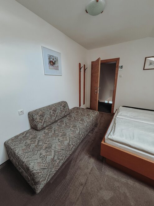 This cozy apartment for up to 3 people features a bedroom and a living-dining area with an additional sleeping option, seating area, kitchenette, coffee machine, and TV. It also includes a shower, a separate WC, and a balcony.