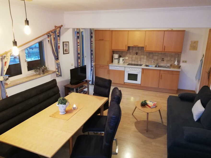 Comfort-FEWO (90 m²) voor 4-6 personen, 2 slaapkamers. Alle kamers met douche/wc, woonkeuken (25 m²), met uitzicht op de bergen.