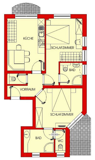 The holiday apartments each have 2 separate bedrooms (each with a shower and WC, and satellite tv), living room/kitchen and balcony. Both can also be extended by one extra room with shower and WC.