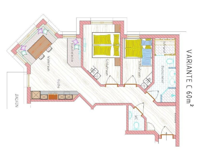 2 separate bedrooms made of austrian pine wood, bathroom, large living area with sofa and open fireplace,