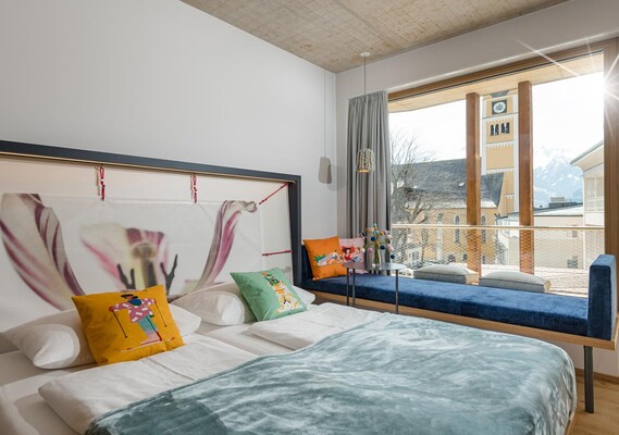 Smart & chic - our Blü single rooms in the main house. Wonderful, west-facing sunny balcony towards Kaiser Franz Platz, with shower or bathtub, toilet, free high-speed WiFi, flat screen TV and safe.