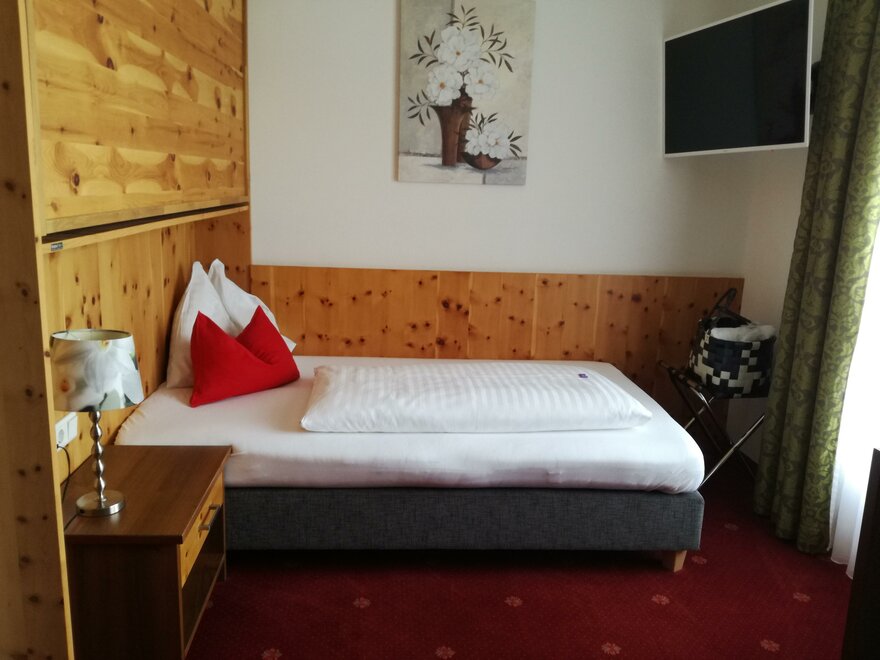 In deze eenpersoonskamer met uitzicht op de Dachstein heeft de gast de beschikking over een groot bed, een bureau, douche, toilet, tv, telefoon en kluis. Een opklapbaar hoogslaper biedt een extra slaapmogelijkheid.