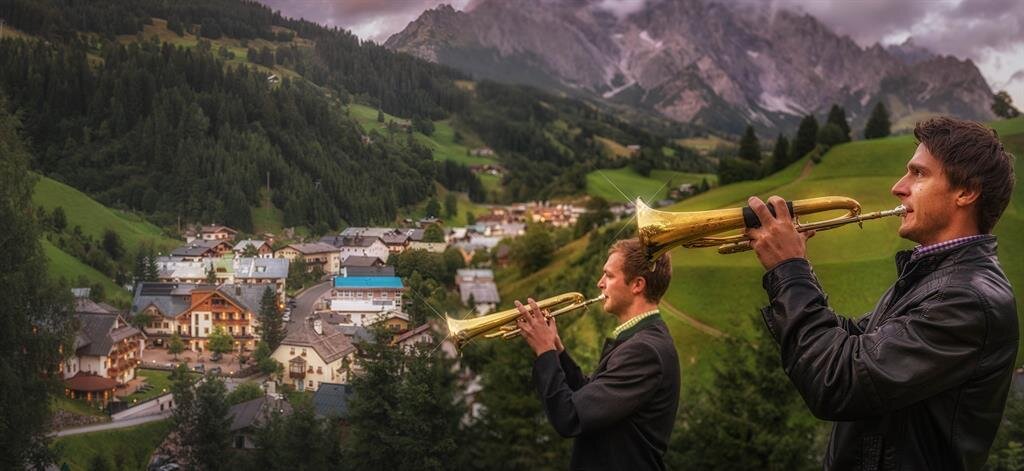 Geweldig terras midden in het dorp Dienten, zwembad met ligweide en