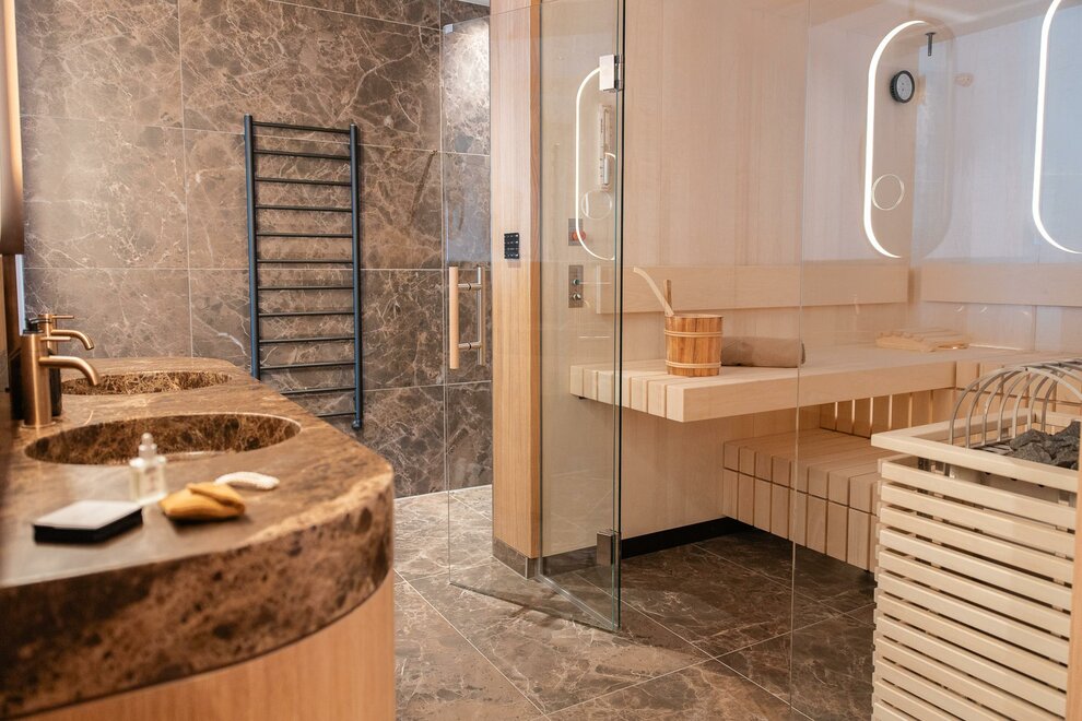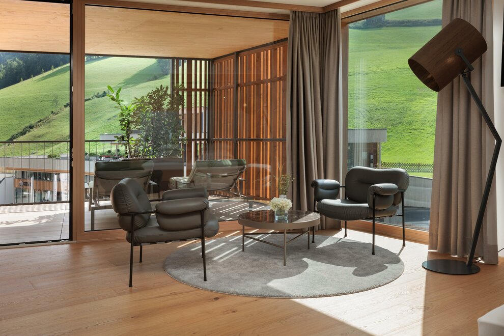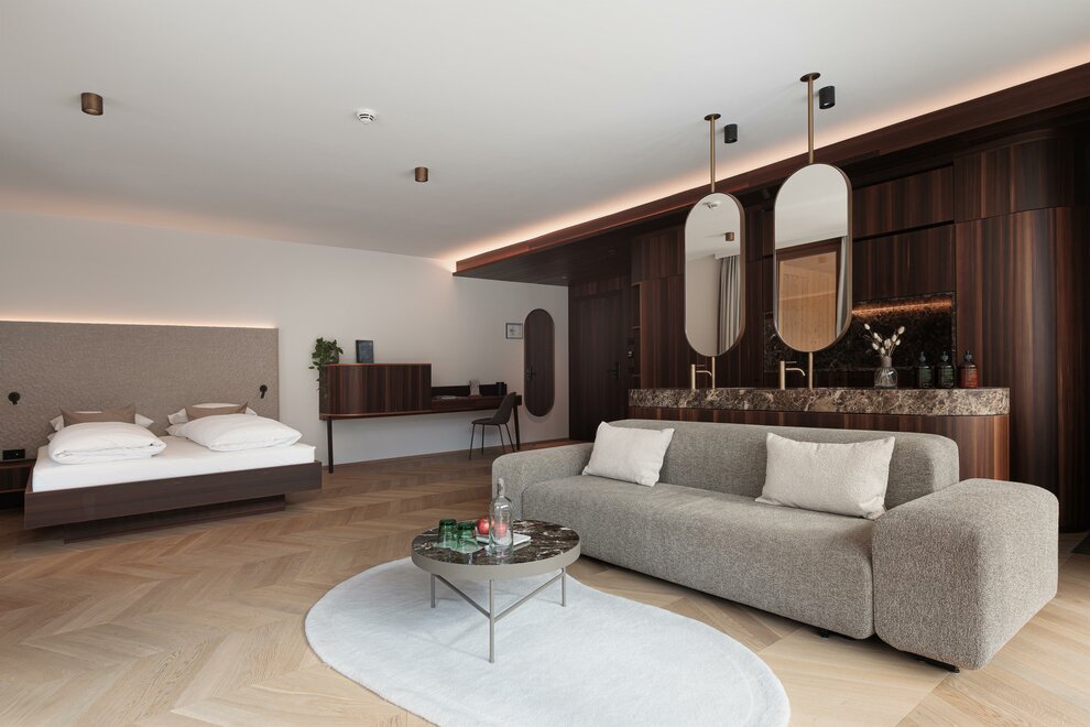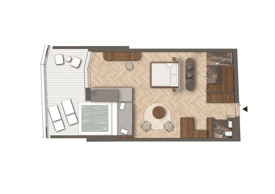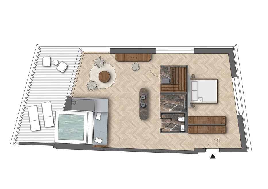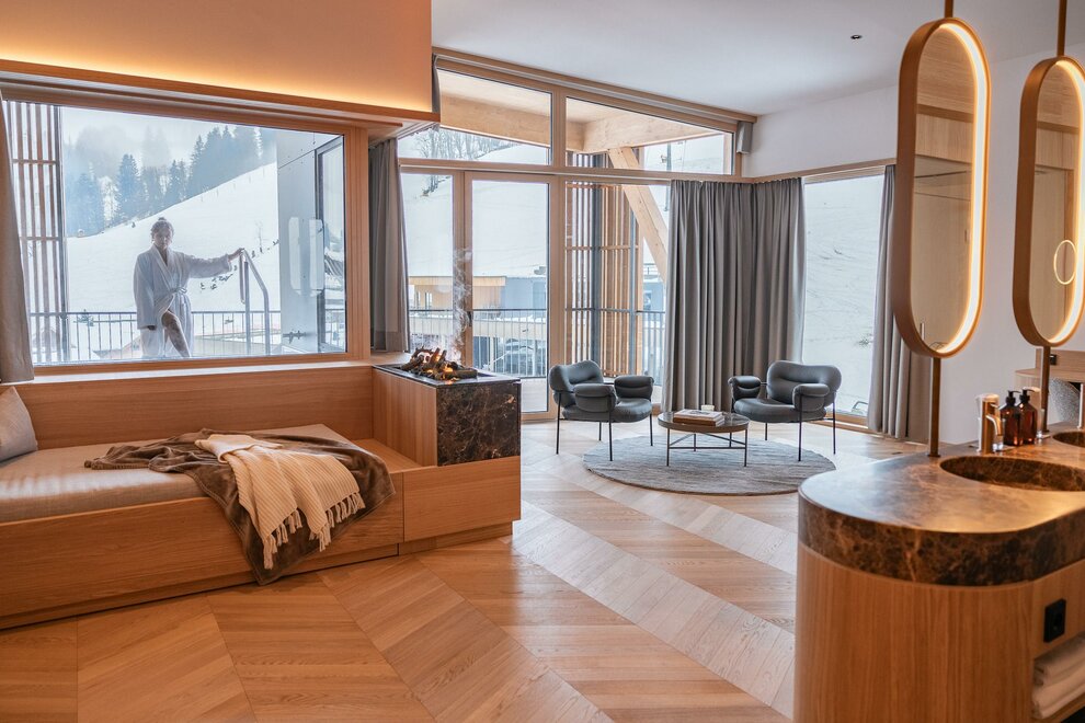 Een suite die geen wensen openlaat. De ruime woonruimte nodigt uit om te ontspannen dankzij de open haard, het daybed en de binnensauna. Of het nu winter of zomer is – op het terras kunt u genieten van het uitzicht op de ligbedden of in de warme whirlpool.
