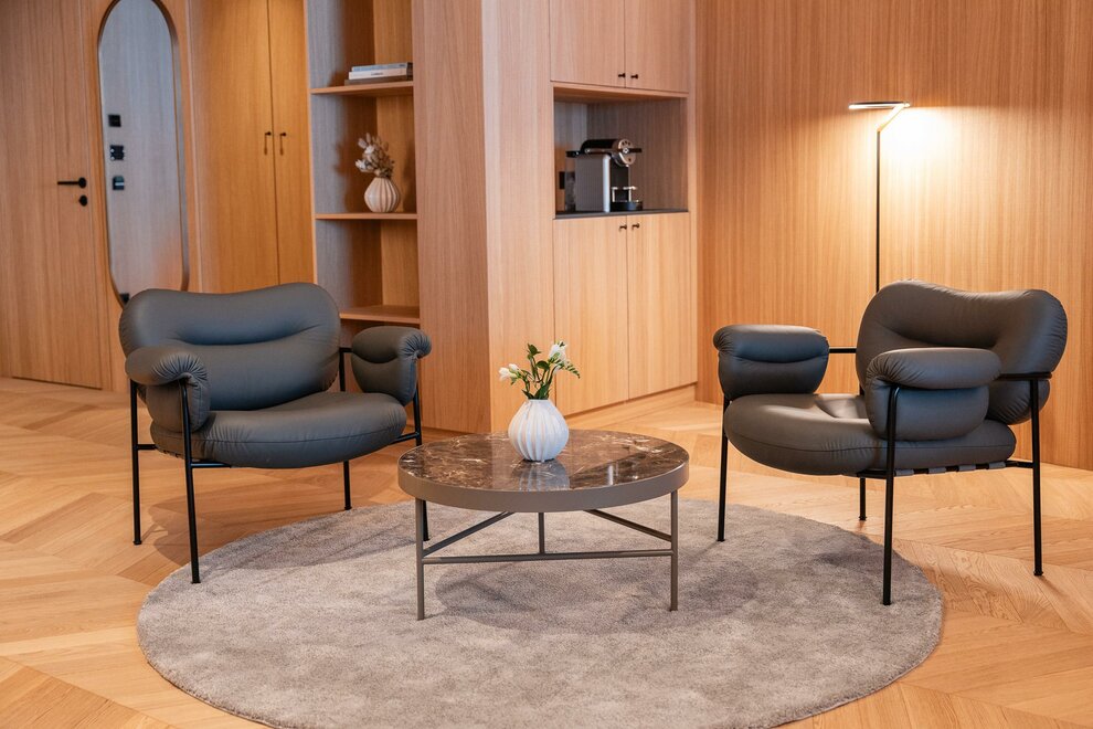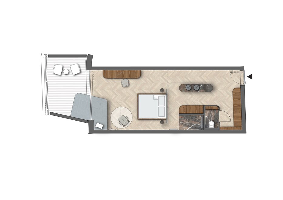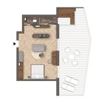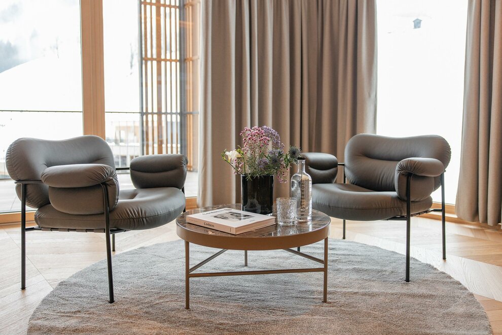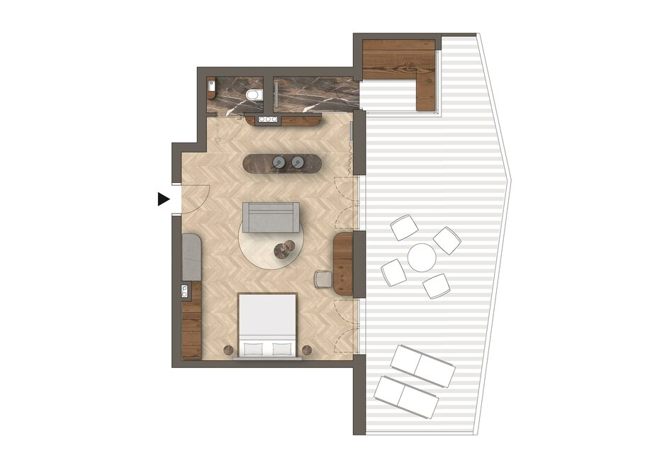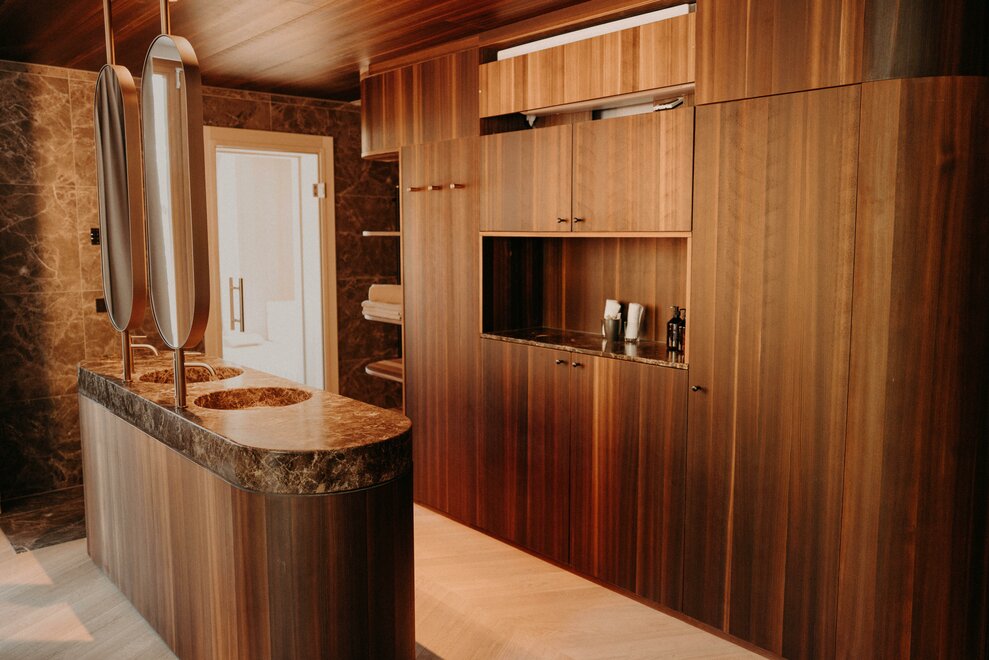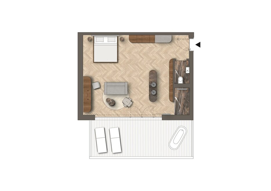 Een suite die geen wensen openlaat. De ruime woonruimte nodigt uit om te ontspannen dankzij de open haard, het daybed en de binnensauna. Of het nu winter of zomer is – op het terras kunt u genieten van het uitzicht op de ligbedden of in de warme whirlpool.