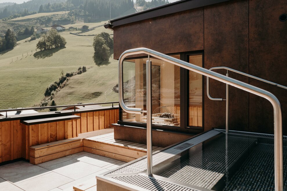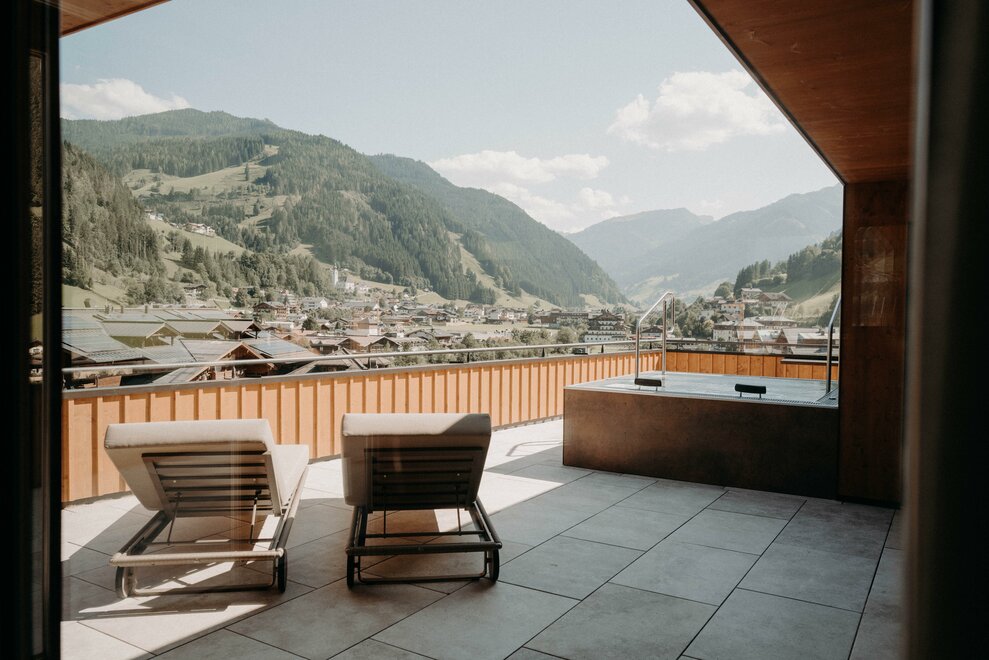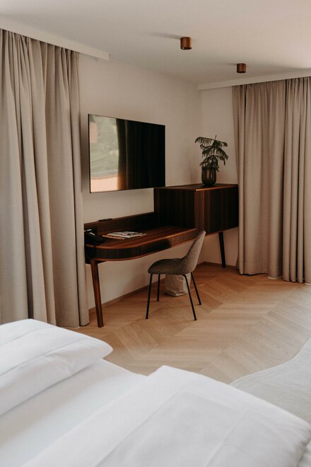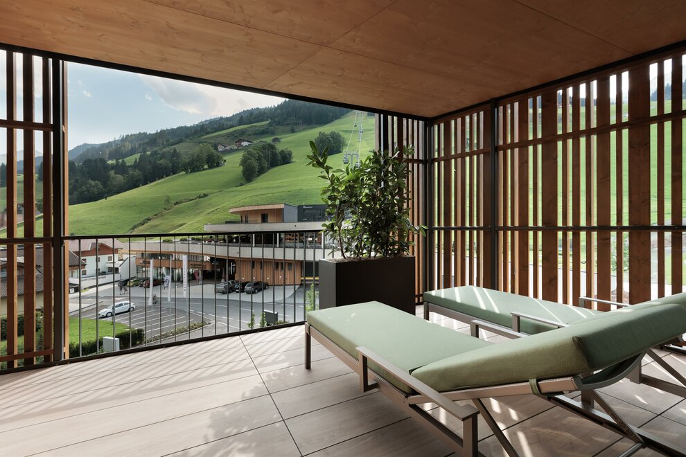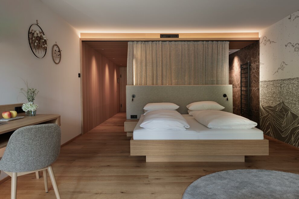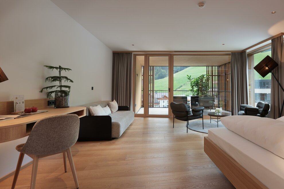 Vanaf de sauna 's avonds naar de sterren kijken - waar kan dat nog? Hier, in de Sterndlgucker Suite! De lichte kamer op de bovenste verdieping van het hotel met een groot terras zorgt voor een extra portie gezelligheid.