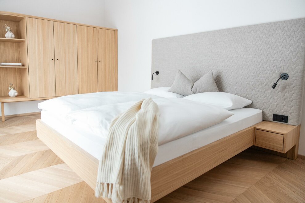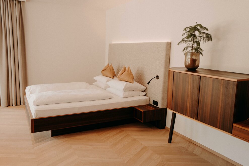 Helder, helderder, tweepersoonskamer Zonnenschein. In de op het zuiden gerichte kamer kunt u de zon tijdens zonsopgang en zonsondergang zien. Onze "Zonnenschein" overtuigt met helderheid, ruimte & een badkuip op het zuidenloggia.