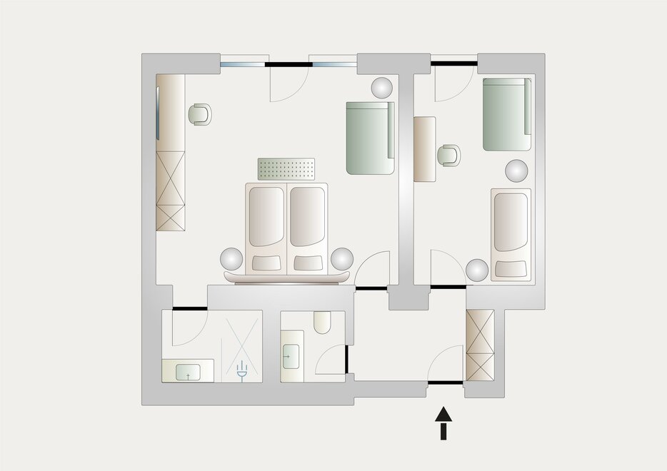 Double room with separat living room, bath or shower, WC, SAT - TV, safe, WLAN, telephone, most with balcony