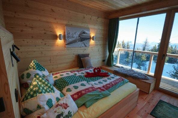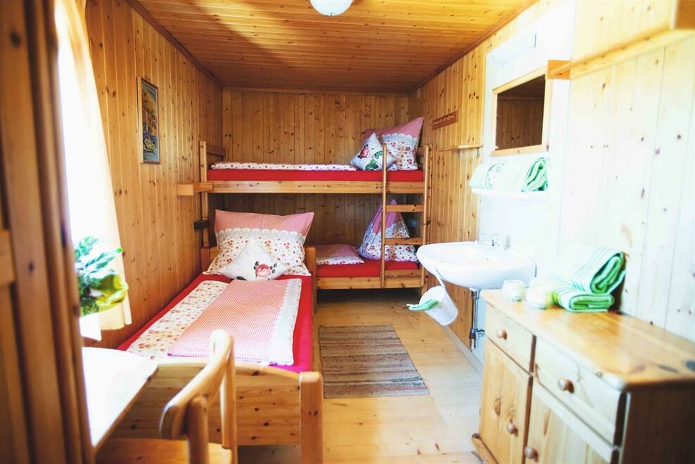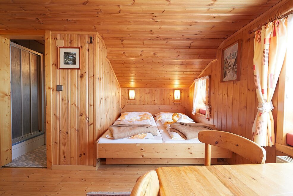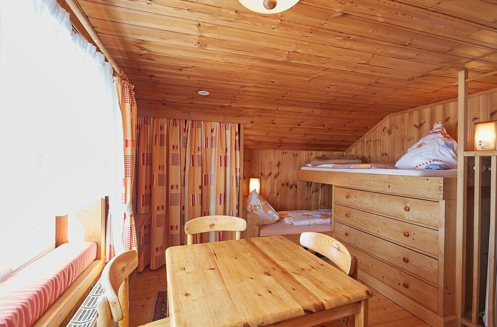 Sfeervolle huttenkamer met een tweepersoonsbed, een stapelbed en badkamer inclusief halfpension en gratis gebruik van onze panoramasauna in het huis. In de zomer ontvangt u van ons de Schladming Dachstein Sommer Card.
